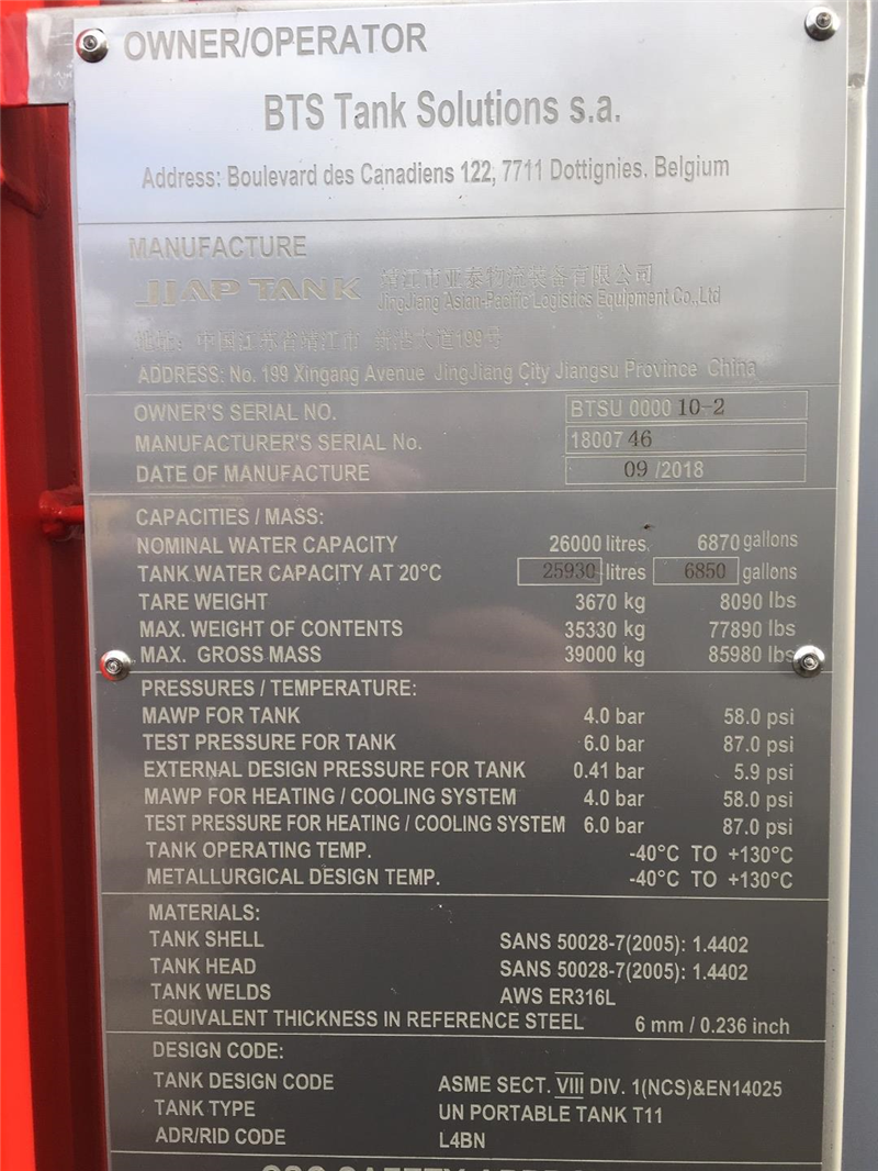 | Design-Code | ASME VIII Div1 & EN14025, where applicable ADR/RID L4BN, UIC, TIR, CSC, ISO1496-3 |